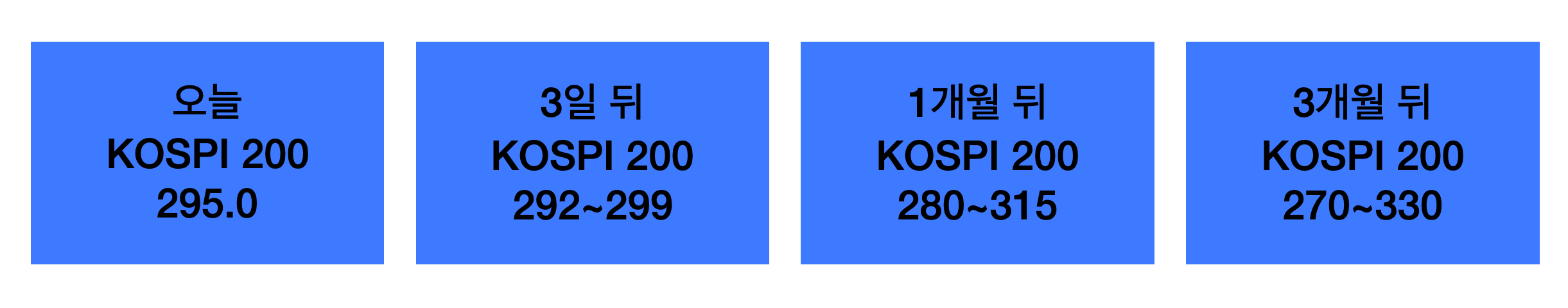 이 그림과 같이 KOSPI 200 지수가 예상된다고 해보자. 3일 뒤 마감인 옵션들은 292~299 이내에서 행사되는 옵션들만 의미 있게 거래될 것이고, 1개월 뒤 마감인 옵션은 280~315, 그리고 3개월 뒤 마감인 옵션은 270~330 내에서 의미 있게 거래되고 있을 것이다.