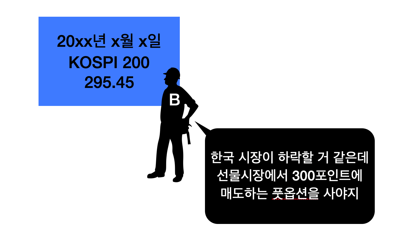 이 반대로 코스피 200지수가 폭락하면서 280까지 내려간다고 하면, 같은 풋옵션의 가격이 20포인트까지 상승할 것이다. 여기서 B는 자신이 투자한 금액에 비해 많은 이익을 얻게 된다.