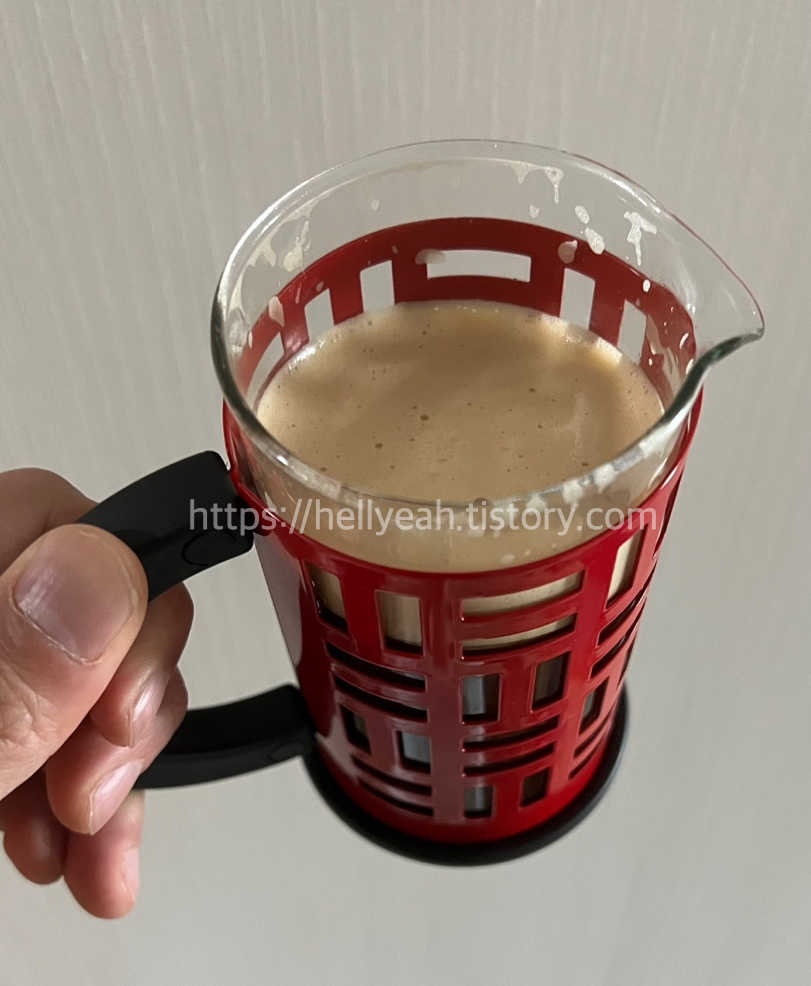 여기서 거품을 내는 요령은 프렌치 프레스의 움직이는 필터 부분을 표면에서만 움직이게 하는 것이다. 완전히 커피 속에 '담근 상태'에서 움직이지 않고, 공기를 섞어주며 움직인다는 느낌이다. 이 요령을 익히면 사진과 같이 부드러운 거품이 만들어진다. 거품을 내는 것은 사용하다 보면 점차 나아진다.