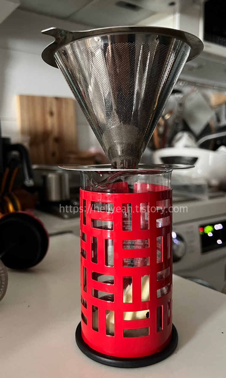 2. 프렌치 프레스에 버터와 MCT오일을 넣은 상태에서, 그 위에 금속필터를 거치하여 커피를 내린다.