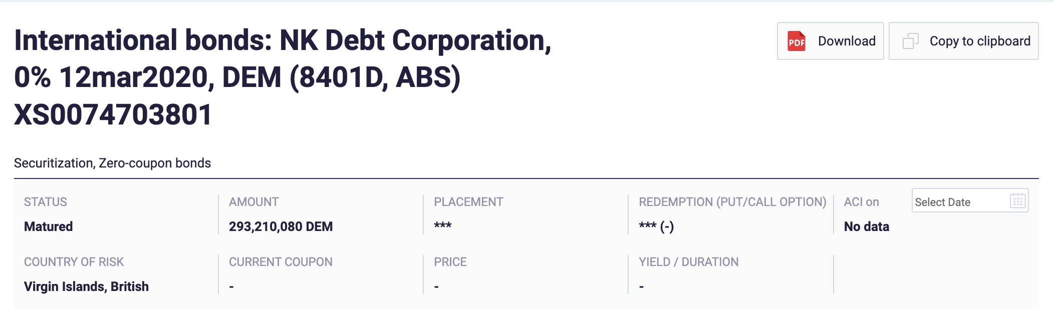'북한채권'은 BNP가 발행한 NK Dept Corporation 채권으로 1997년 발행되어 거래되었다. 액면가는 1달러지만, 거래 시세는 겨우 1-2센트 수준으로 사실상 가치가 없다고 보면 된다. 다만 2020년 3월을 끝으로 더 이상 연장되었다는 기록은 없다.