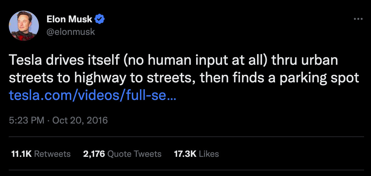 영상에서는 사람이 핸들에 손을 대지 않고 차량이 이동하는 모습이 나타난다. 그리고 일론 머스크도 그 당시 트위터에서 테슬라의 자율주행을 홍보하기도 했다.