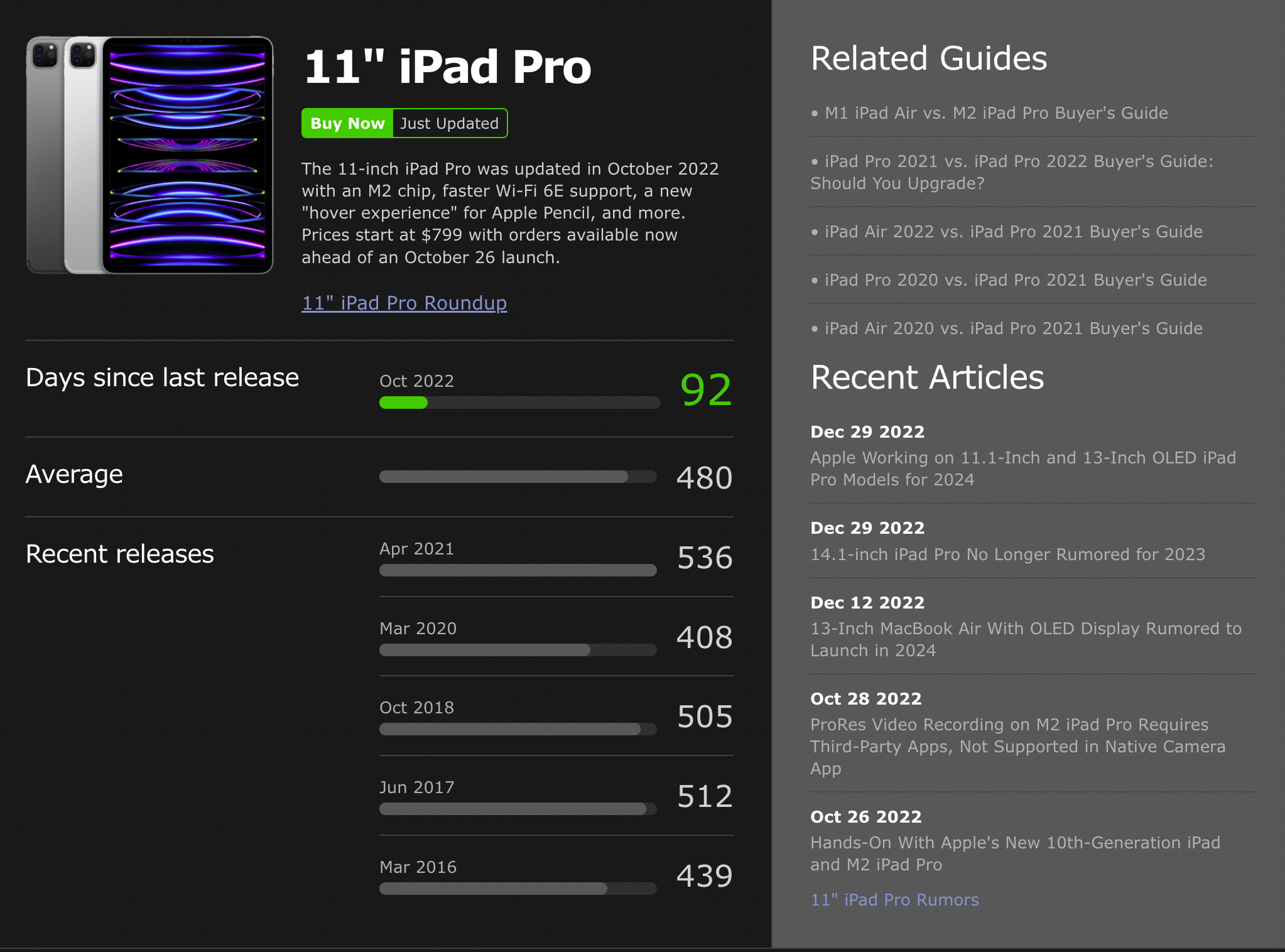 2023년 1월 19일자로 11인치 아이패드 프로의 경우에는 발매된 지 92일이 지난 상태다. 신제품 발매의 평균 일정이 약 480일이기 때문에, 현재 구매하게 된다면 기능을 충분히 활용할 수 있다. 그래서 'Buy Now'라는 녹색 문구가 떠있게 된다.