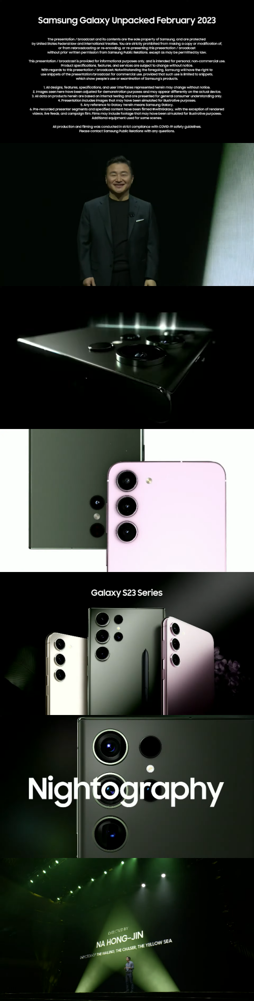 갤럭시 S23의 스펙은 예상대로 CPU의 업그레이드와 카메라의 업그레이드가 있었다. 단 2억 화소의 카메라는 울트라에만 탑재되어 있다. 이번 언팩행사에서 가장 인상적인 것은 '나이토그래피'기능을 강조하기 위해 나홍진 감독의 작품이 갤럭시로 촬영되었다는 내용이었다.