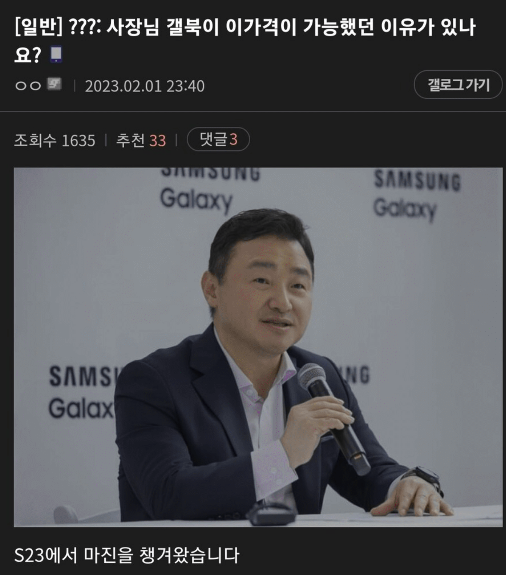 평소 삼성의 노태문 사장은 신제품을 발표하면, '원가절감 밖에 모르는 바보'라고 불리면서 악플이 달리는 것이 보통이었다. 하지만 간밤의 행사에서는 갤럭시 북 3으로 인하여 이런 드립까지 나오고 있는 실정.