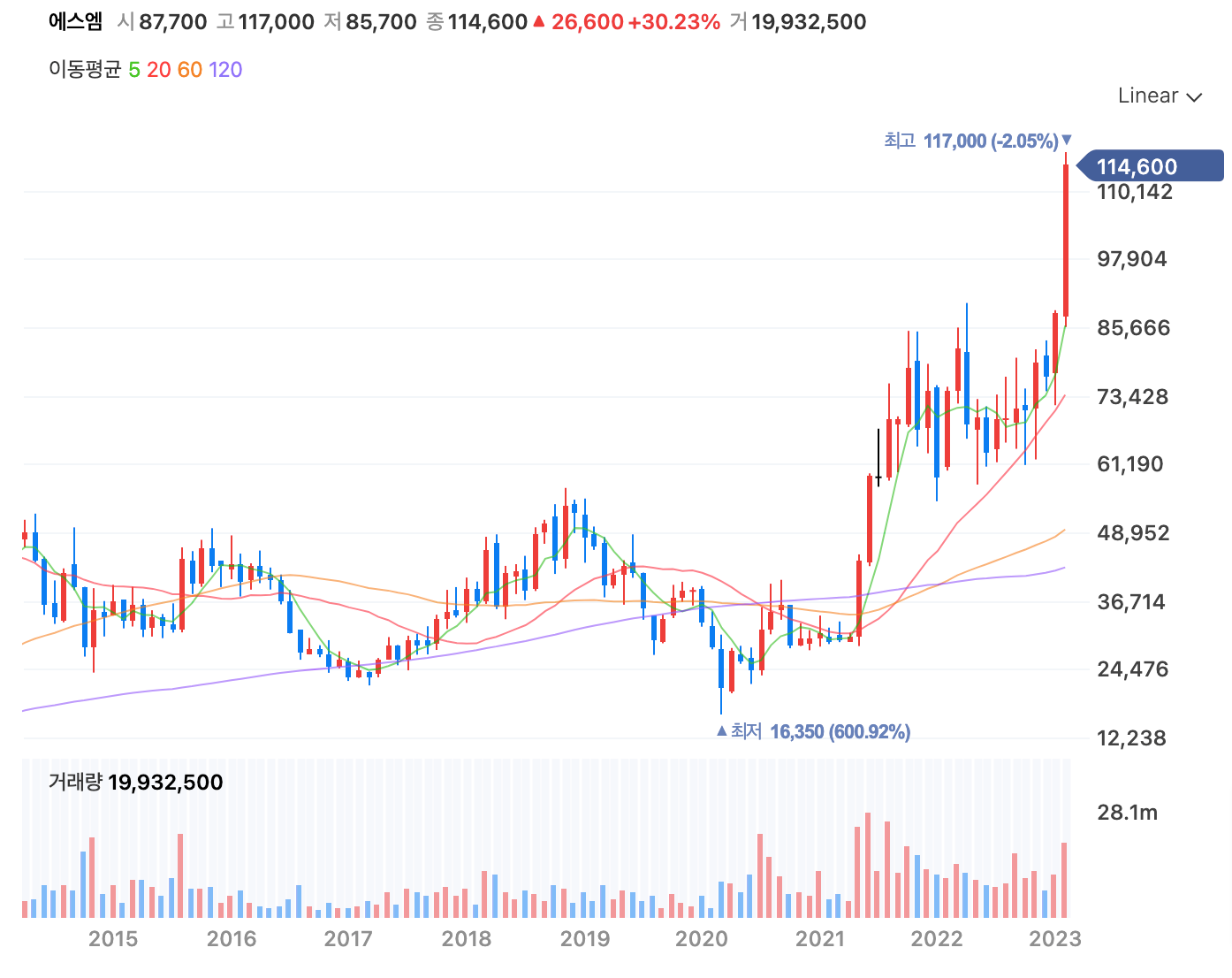이수만 총괄 프로듀서는 자신의 에스엠 지분 18.5% 중에서 14.8%에 해당하는 주식을 하이브에 넘겼고, 하이브는 에스엠을 인수합병하기 위해 공개매수를 시작하였다. 공개 매수 가는 주당 12만 원.
