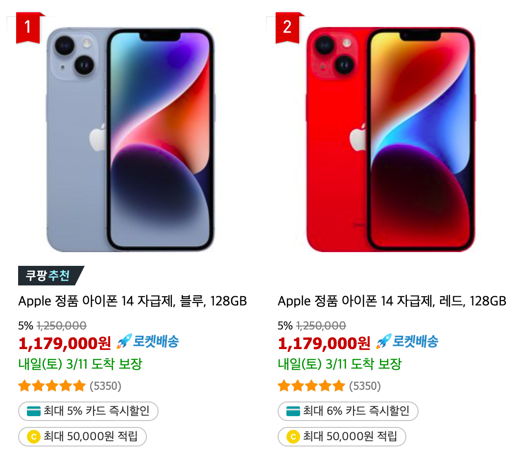 온라인 쇼핑몰의 행사를 이용한 구매도 괜찮은 할인 기회가 된다. 쿠팡의 경우에는 주기적으로 애플 제품에 대한 할인을 진행한다. 현재 아이폰 14 모델의 경우 제휴카드 할인으로 약 2%~6%까지 추가할인을 해주고 있다.