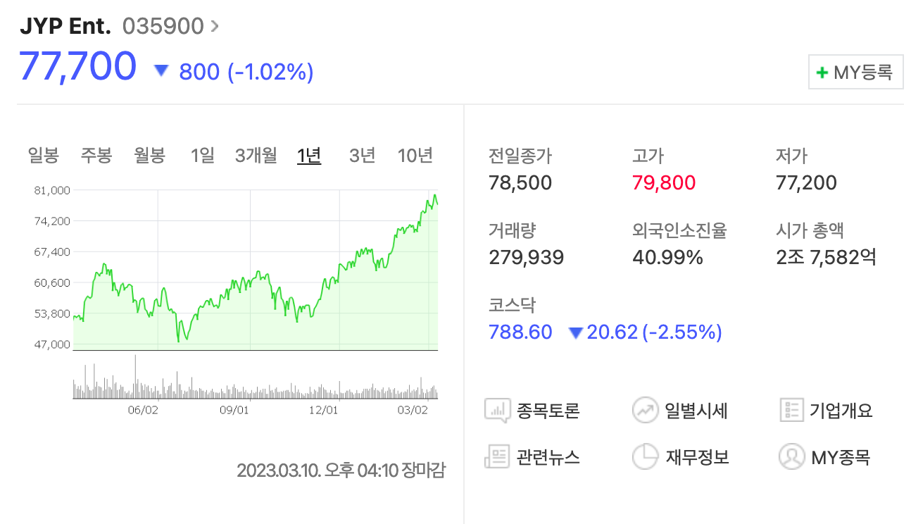 하지만 에스엠이나 하이브와 같이 경영권 분쟁이 없는 상황에서 본업으로만 조용히 신고가를 찍고 있다는 점에서 분명 주목할만한 종목이다.