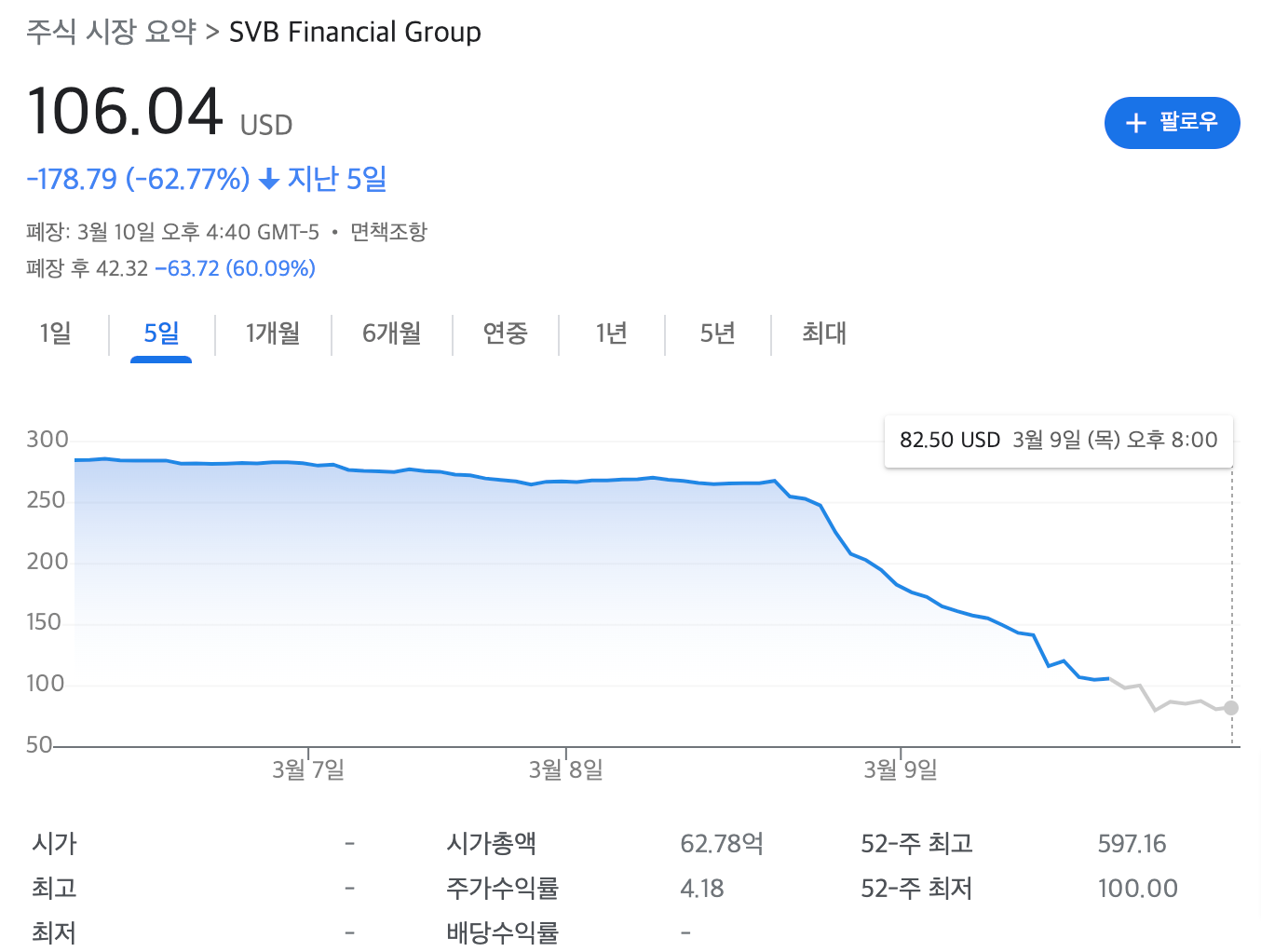 - 금리상승으로 인해 가격이 떨어진 미국채를 매각하면서 발생한 손실로 파산에 직면했다.
