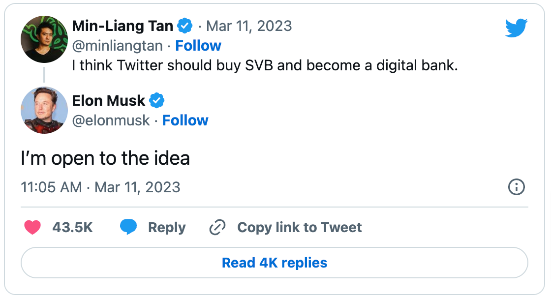현재 일론 머스크가 갑자기 SVB의 인수를 고려하고 있다고 하면서 새로운 국면을 맞이할 수도 있겠다.