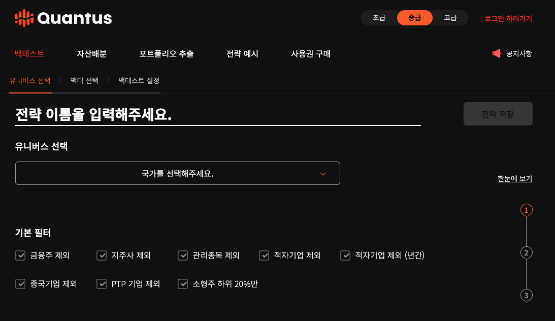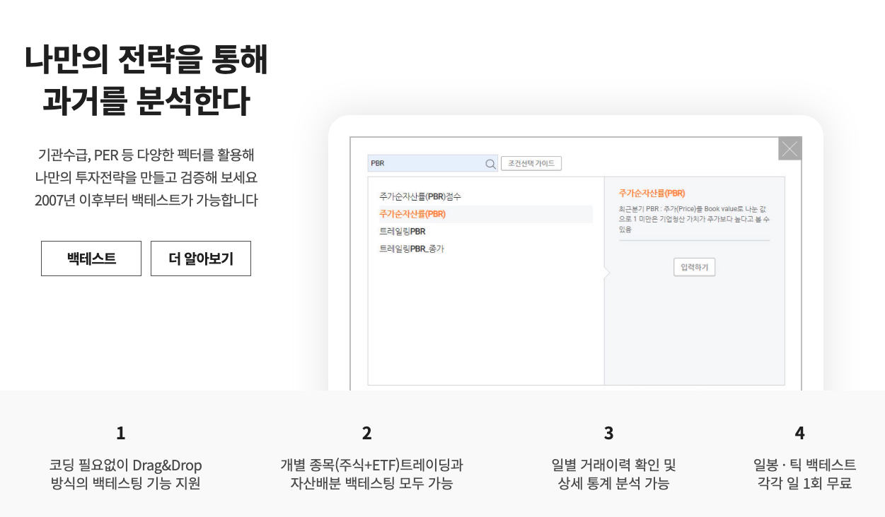 퀀트 투자에 관심 있는 사람들이 직접 파이썬이나 R을 이용하여 알고리즘을 구축하기에는 시간이 걸린다. 그렇기 때문에 아래 소개하는 사이트를 활용한다면 비교적 쉽게 퀀트의 맛을 볼 수 있다.