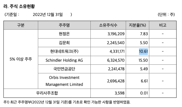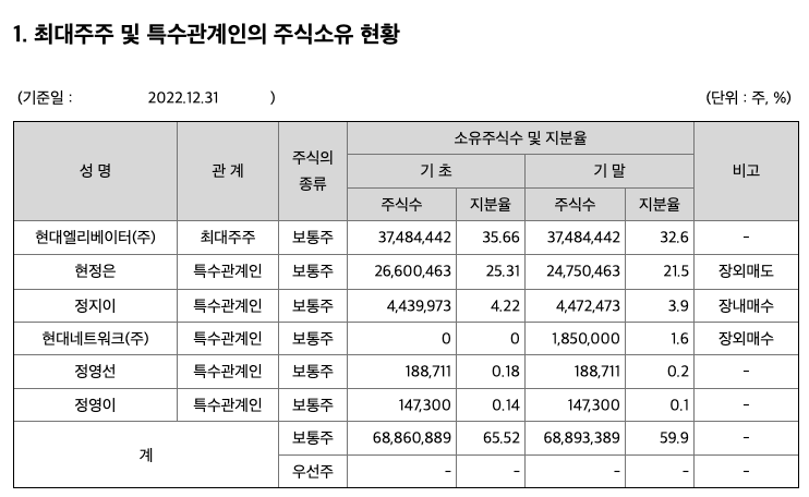 위 표에 나타난 것처럼, 현대엘리베이터는 이미 현대무벡스의 최대주주다. 32.6%의 지분율을 가지고 있다. 현정은의 지분 21.5%를 가져가게 되면 54.1%의 최대주주로 올라서게 된다.