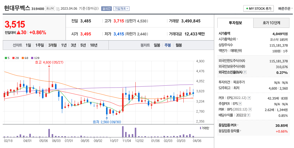 지난 글에서 지적했던 현정은 회장의 1700억 원을 현대무벡스 주식으로 갚기로 결정했다고 한다. 현대무벡스는 2023년 4월 6일 현재 3515원으로 종가 마감하였다. 현정은 회장이 지니고 있는 현대무벡스 주식은 2475만 주가량이며, 현재 시가로 약 870억 가량이 된다.