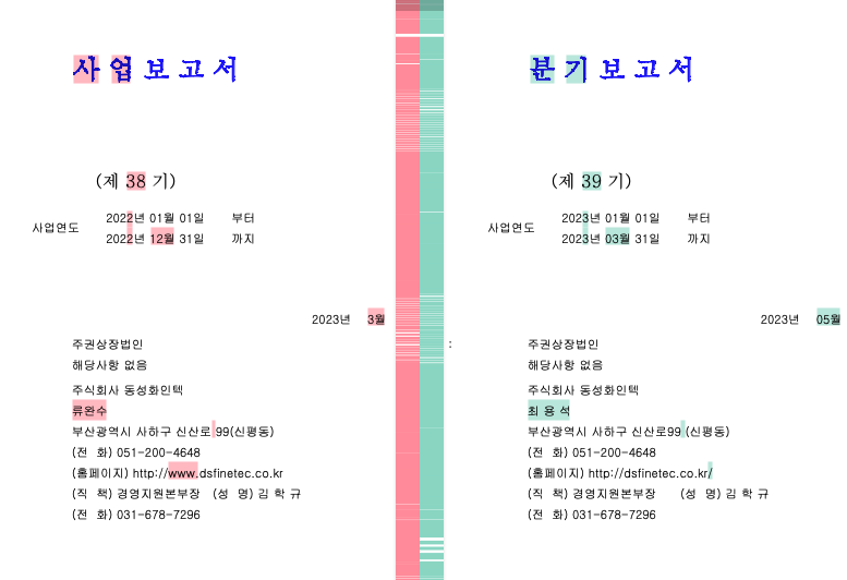 사업보고서의 순서가 바뀔 경우에는 내용 변화를 그대로 인식하기 때문에 전체가 음영처리된다. 그러므로 사업보고서 목차가 비슷한지 확인해 볼 필요가 있다.