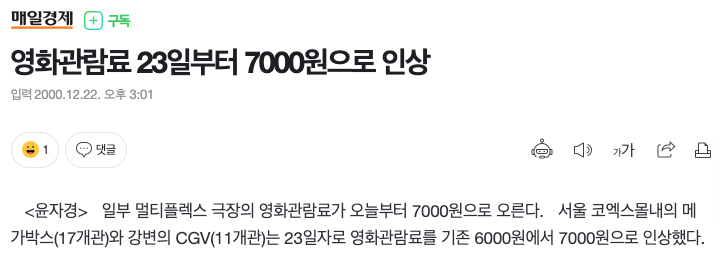2000년대에 들어서며 '단관 극장'의 시대가 '멀티플렉스'로 변화하기 시작하던 무렵, 티켓의 가격은 5천 원에서 7천 원 내외였다. 이 당시의 1인 식사가격이 보통 3~4천원이던 시절이기 때문에 영화 티켓은 한 끼에서 두 끼 정도의 식대에 해당했다.