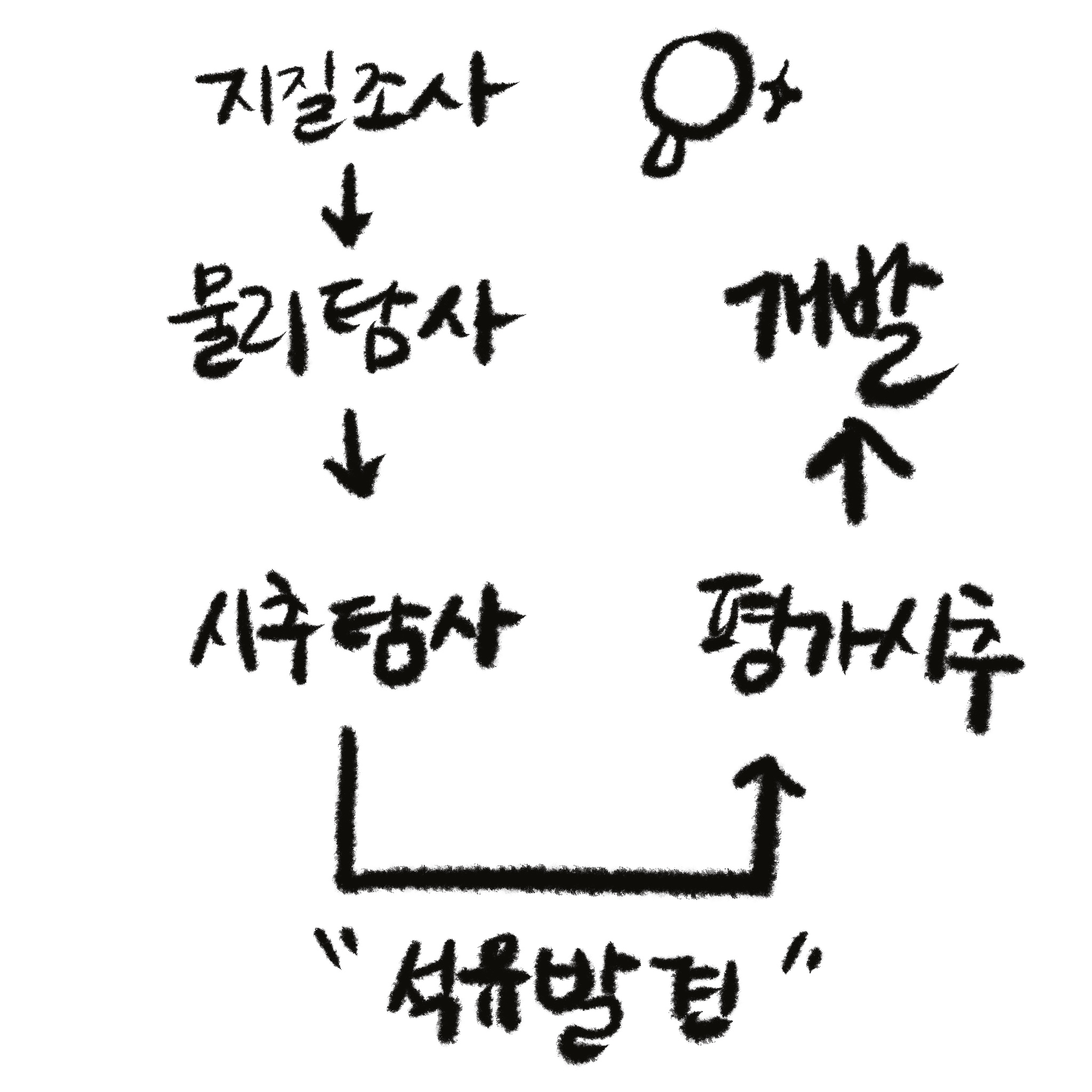 이다음이 바로 '물리탐사'의 단계다. 탄성파나 중력, 자력 등을 이용하여 표면을 덮고 있는 지반 이면의 성분들을 분석한다. 오늘 대통령이 발표한 단계가 바로 이 물리탐사의 단계다.