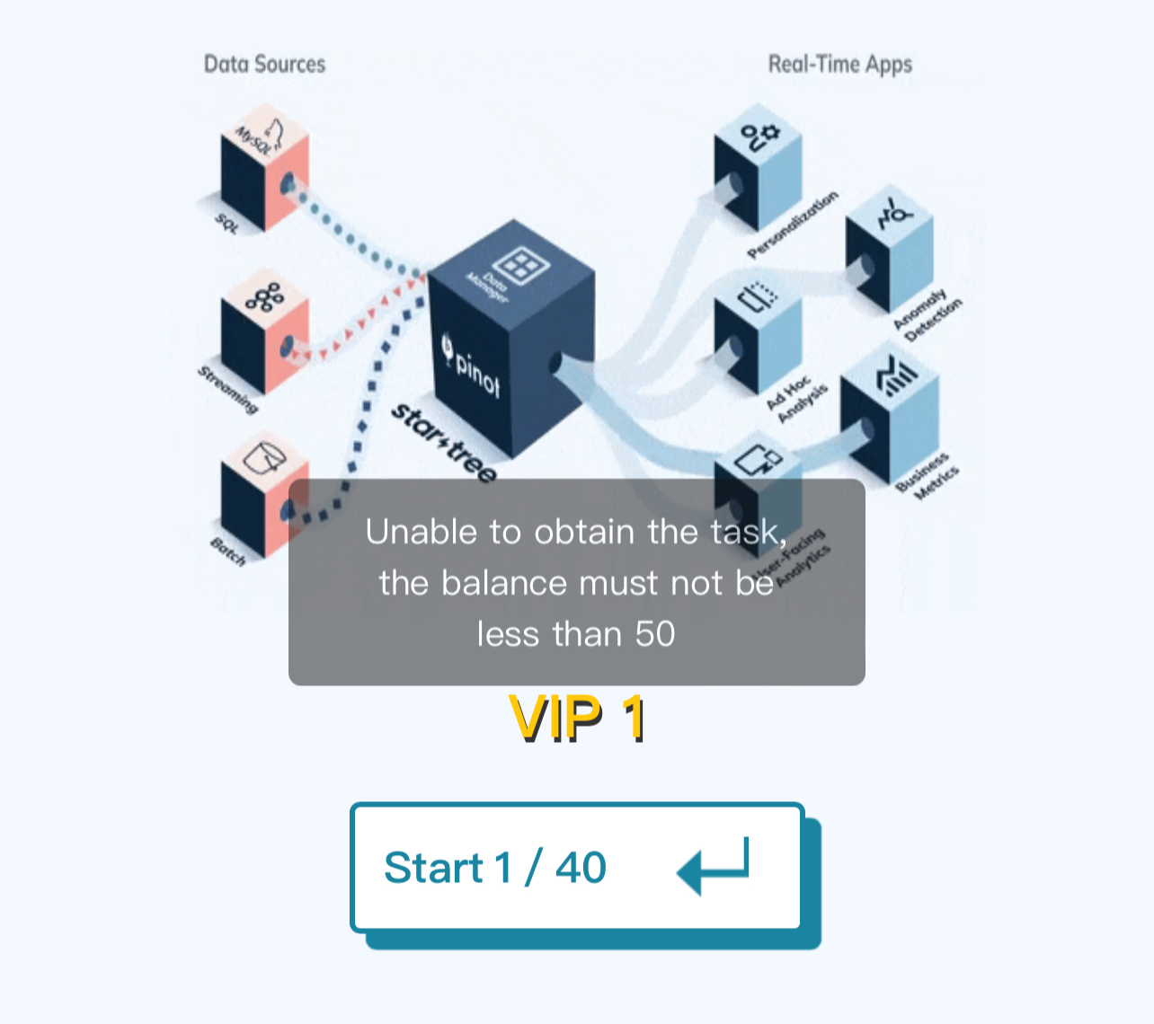 트레이닝 계정에는 1615 USDT가 입금되어 있다. 이걸 가지고 업무를 해보라고 하는데, 업무는 정말 단순하다. 화면 아래의 Starting 이란 버튼을 누르면 열리는 다음과 같은 화면에서 가운데 Start 버튼만 누르면 된다.