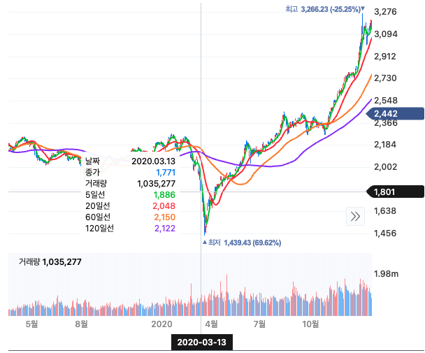 그리고 3월 19일 두 번째 서킷브레이커가 나올 정도의 매도가 이루어진 시점에서 코스피 지수는 1439까지 수직낙하하였다. 지수상으로 약 800포인트가 빠졌고, 35% 가량이 빠진 것이다. 시장 모든 종목이 하한가를 한 방 맞은 수준이다.