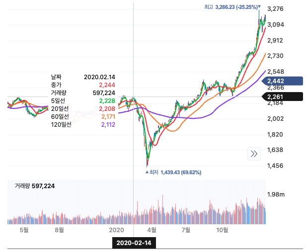 2020년 2월 14일을 단기 고점으로, 전체적인 시장의 하락이 시작되었다.