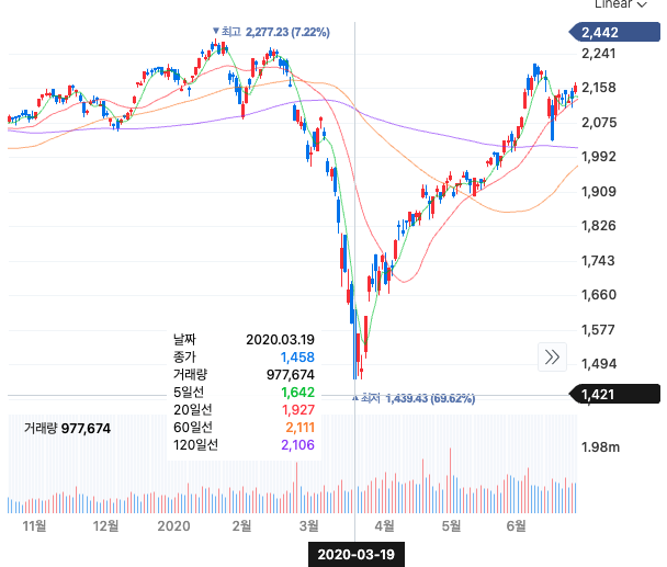 코로나가 중국에서 창궐하고, '엄청난 중국 전염병'이 돌고 있다는 말이 돌기 시작한 무렵이 2020년 1월과 2월 중이다. 이 당시에는 중국 물류 유통에 문제가 조금씩 발생하는 수준에 그치고 있었다. 그래서 코스피는 단기적으로 2200선을 오르락내리락하고 있었다.
