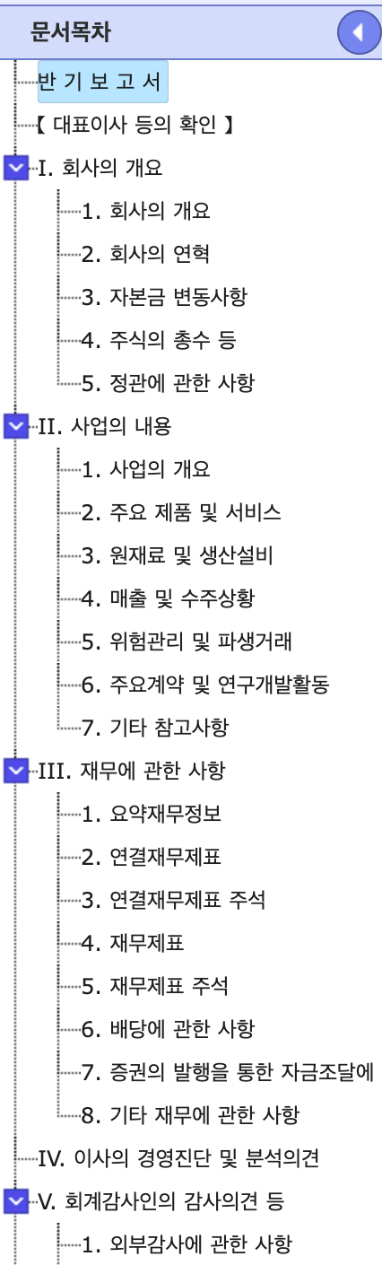 보고서를 클릭해보면 위와 같은 목차가 뜨게 되는데, 이는 반기, 분기, 사업보고서가 거의 공통이다.