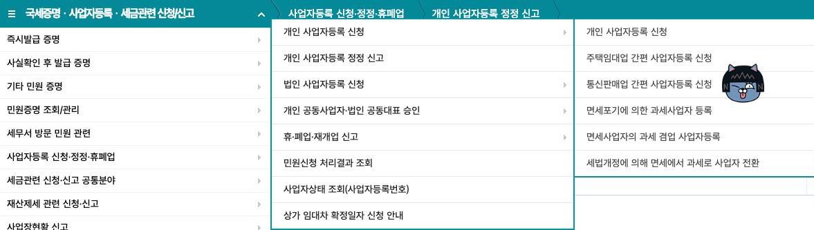 홈택스 사이트에서 '사업자등록'에서 개인 사업자 등록신청을 하면 됩니다. 최근에는 통신판매업(스마트스토어, 블로그 마켓 등)을 운영하는 사람들이 많아서 '통산판매업 전용' 신고 칸이 따로 만들어져 있습니다.