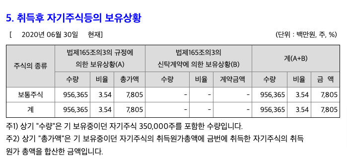 동성화인텍은 2020년 자기 주식을 취득하며 약 60만 주를 매수하였습니다. 당시 평균가격은 8,240원으로 총 50억 가량을 사용하였습니다. 그리고 이 주식과 보유주식 30만 주를 합하여 120억을 빌린 셈이죠. 정리하자면 동성화인텍은 약 60억 정도의 금액으로 120억을 사용한 셈입니다.
