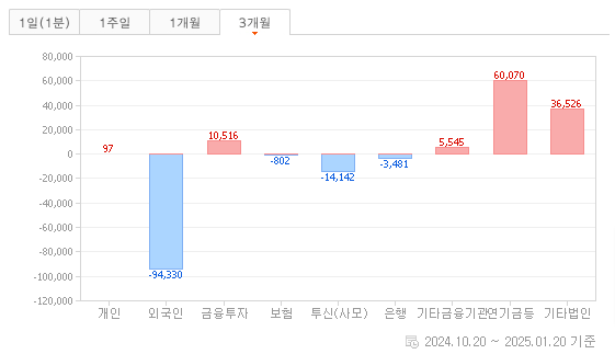연기금과 같은 기관계 자금이 꾸준하게 한국 주식을 매수하고 있다는 것입니다. 그리고 개인 투자자들의 이탈과 외국인 투자자들의 이탈도 계속 이어지고 있는 것으로 보입니다.