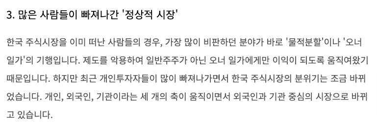 개인이 빠져나간 시장에서 가격을 올릴 수 있는 방법으로 '코리아 디스카운트'를 해소하는 쪽을 선택한 게 아닐까라는 생각이 드는 지점입니다.