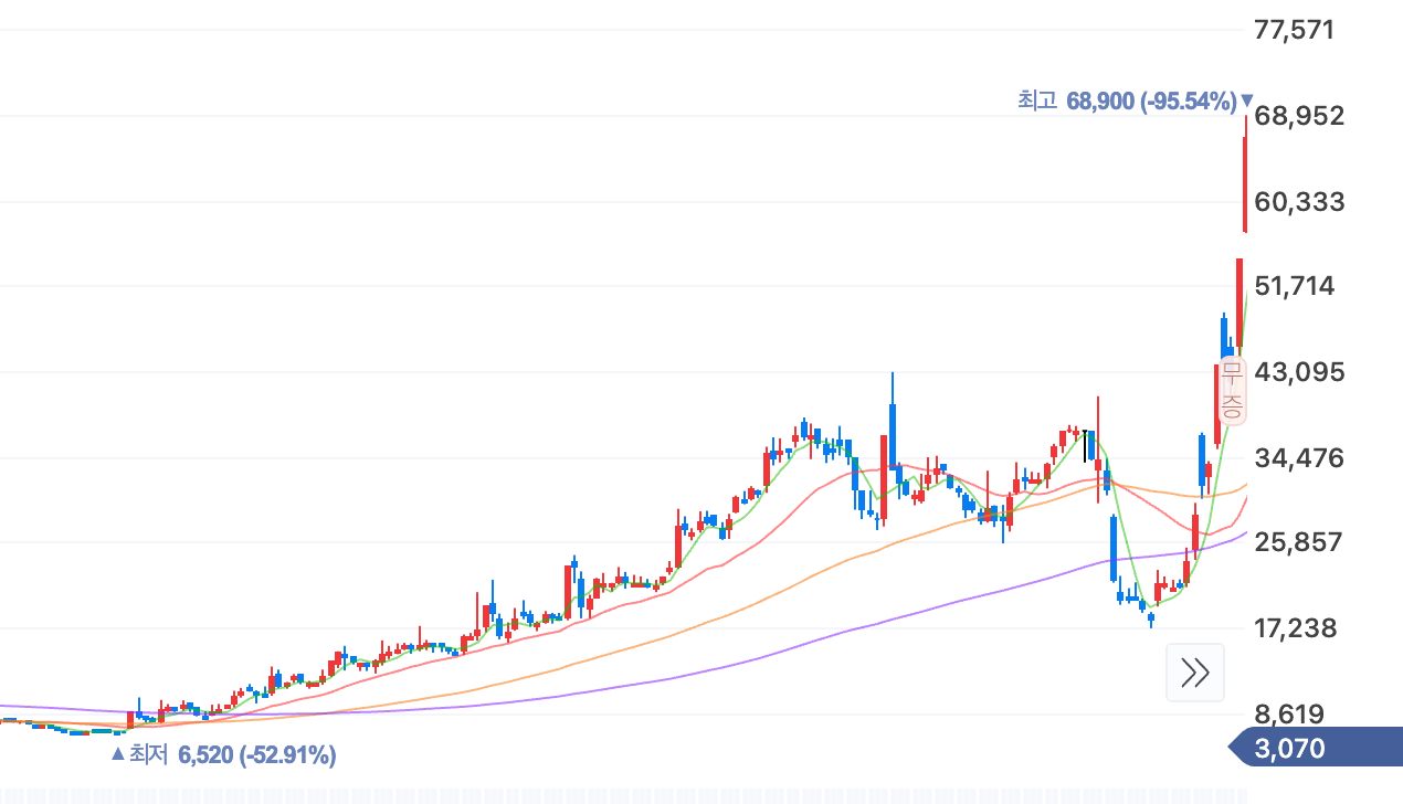 현재 해당 회사의 주가는 10:1 병합을 진행한 상태라, 현재 차트를 다시 보면 당시 가격의 10배로 표기되어 있는 상태입니다.