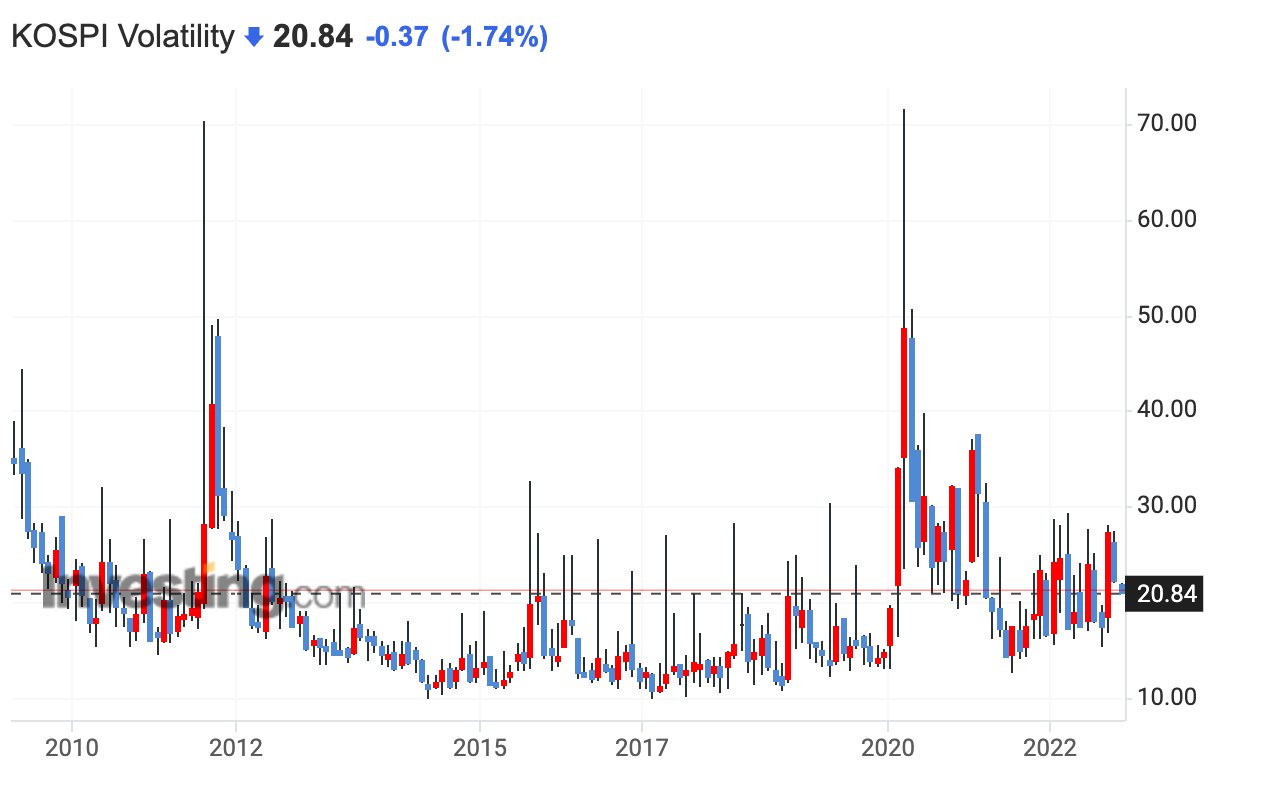 Investing 사이트에서 대략적으로 추출한 VKOSPI - 한국 코스피 변동성 지수에 대한 그래프다.
