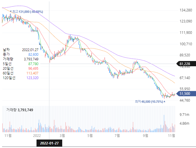 이때 주식을 팔지 못하고, 5만 원 대까지 투자금이 녹아내린다.