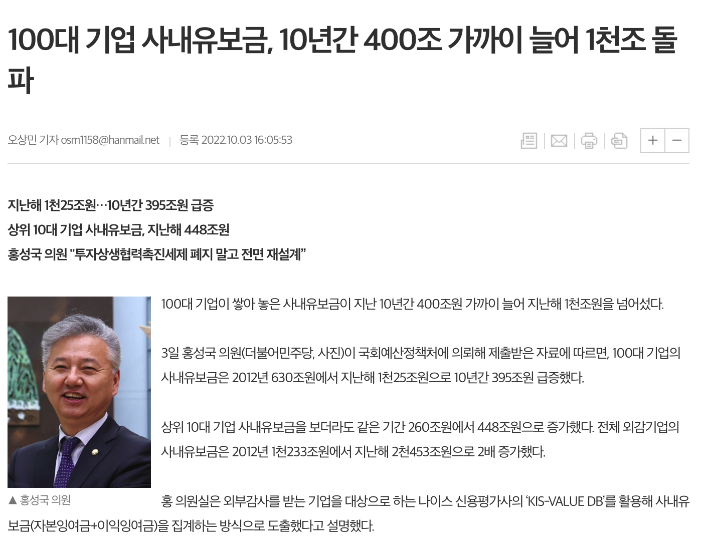지난 2022년 10월 3일자 기사에, '100대 기업 사내유보금, 10년간 400조 가까이 늘어' 라는 말이 있었다.