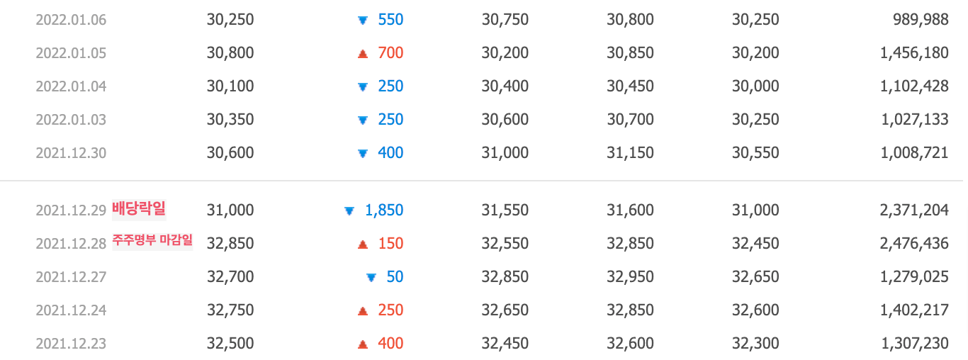 2021년 12월 28일 KT의 주가는 32,550원에서 시작하여 32,850원으로 마감했지만, 12월 29일에는 1,000원 하락한 상태에서 거래가 시작되었다. 2020년 배당액이 1,350원이었기 때문에 약 1,000원 정도의 배당락으로 시작한 셈이다. 29일 종가는 31,000원으로 1,850원 하락하여 마감했다. 다만 2021년 배당액은 1,910원이었기 때문에 28일에 매수하고, 29일에 매도했어도 괜찮은 투자가 되었을 것이다.