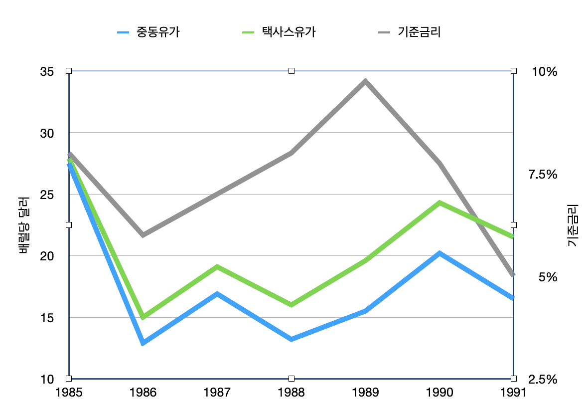 이 두 가지 방법이 어우러지며 80년대 금리는 결국 국제원유가격과 밀접하게 연관된다. 국제원유가격이 결국 물가를 움직이기 때문에, 기준금리가 비슷하게 움직일 수밖에 없었다.