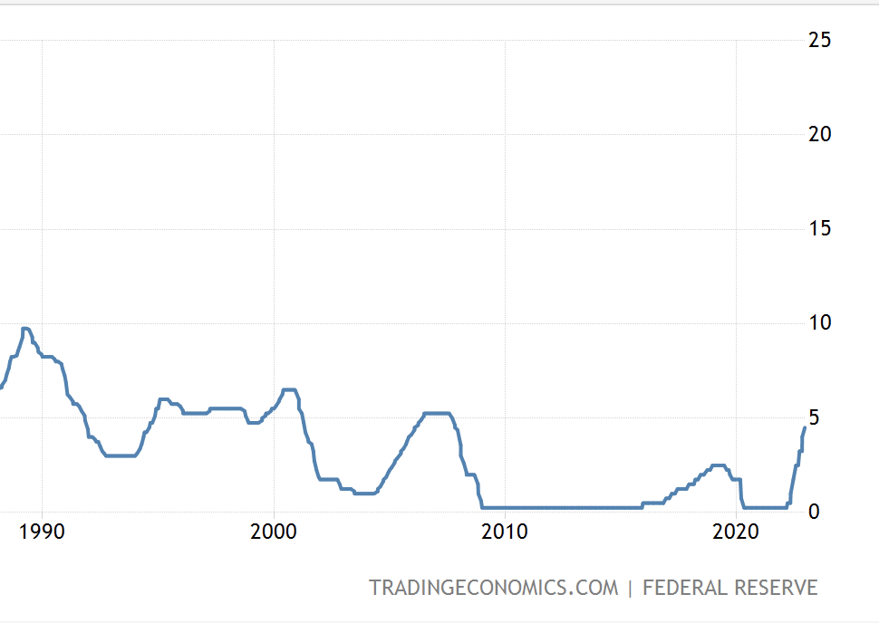 그리고 2021년부터 연준은 그동안 급격하게 풀었던 달러를 회수하기 위해 빠르게 금리인상을 하겠다고 하며 금리 인상을 이어오고 있다. 1년 동안 4.5%의 금리 인상을 단행하면서 고삐를 빠르게 조이고 있다.